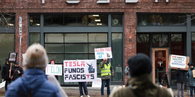 Anti-Elon Musk protesters have taken to Tesla showrooms across the United States / ©AFP
