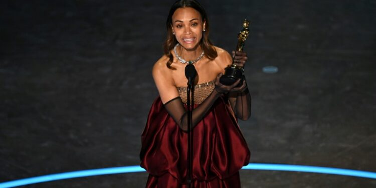 Hollywood (United States) (AFP) – Zoe Saldana was nearly unrecognizable as a blue Na’vi princess in the “Avatar” franchise, and wore green makeup to play the reformed assassin Gamora in the “Guardians of the Galaxy” films. But in the psychedelic narco-musical “Emilia Perez,” for which she won an Oscar on Sunday, the performer of Dominican and Puerto Rican descent spoke, sang and even rapped in her native Spanish — fully inhabiting her own Afro-Latina skin.