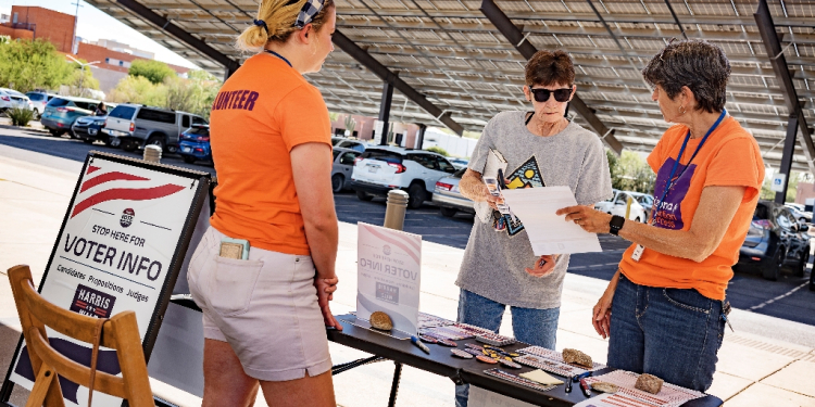 In the mid-sized city of Tucson, hundreds of volunteers in orange T-shirts were going door-to-door to try to persuade voters to back a ballot measure to inscribe abortion rights in the state constitution — and, while they’re at it, to vote for Vice President Harris. To Grace Ireland, a 26-year-old activist, the abortion restrictions imposed by several Republican-controlled states amount to “a public health crisis that Donald Trump and the Republicans have created.” She added, “Democrats and Kamala Harris are trying to push us forward and protect women’s health care and protect our democracy and protect all people.”