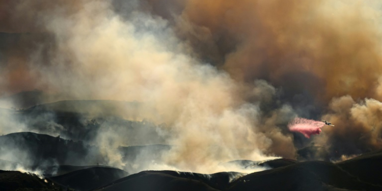 Calabasas (United States) (AFP) – In the skies above Los Angeles, air tankers and helicopters silhouetted by the setting California sun dart in and out of giant wildfire plumes, dropping much-needed flame retardant and precious water onto the angry fires below. Looking in almost any direction from a chopper above the city, AFP reporters witnessed half a dozen blazes — eruptions of smoldering smoke emerging from the mountainous landscape like newly active volcanoes, and filling up the horizon.