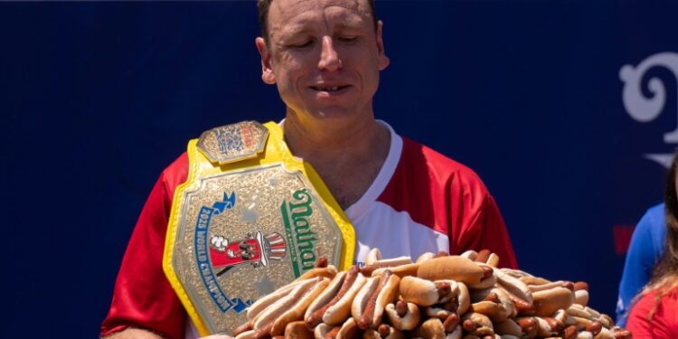 NEW YORK, NEW YORK - JULY 4: Joey Chestnut wins the men's competition at Nathan's Annual Hot Dog Eating Contest on July 4, 2025 in New York City. ©AFP