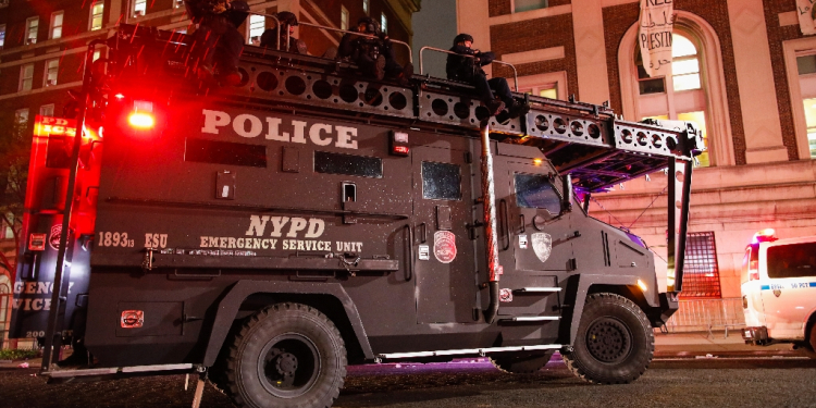 (AFP) – As a storm broke over New York, riot police mounted a tall ladder on a reinforced truck to penetrate a building at Columbia University and clear out barricaded pro-Palestinian protesters.