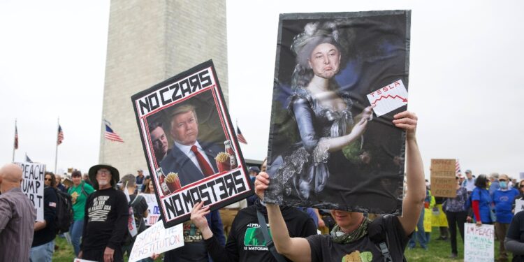 (AFP) – Thousands of people descended Saturday on Washington’s National Mall and rallied in other cities across the United States and abroad in opposition to the policies of Donald Trump, in the largest protests since he returned to the presidency. A big “HANDS OFF!” banner stretched across the stage of an outdoor theater just a few blocks from the White House, with protesters holding signs that read “Not My President!”, “Fascism has Arrived,” “Hands Off Our Social Security” and “Wake Up and Smell the Coup.”