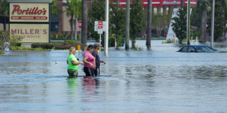 People walk through flooded streets in the Southeast Seminole Heights neighborhood of Tampa, Florida, inundated by Hurricane Milton, on October 10, 2024. ©AFP