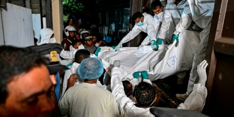 Healthcare workers carry the bodies of Iranian sailors who died in a US torpedo attack on their frigate IRIS Dena off Sri Lanka's southern coast, at the mortuary of the Karapitiya hospital in Galle on March 4, 2026. ©AFP