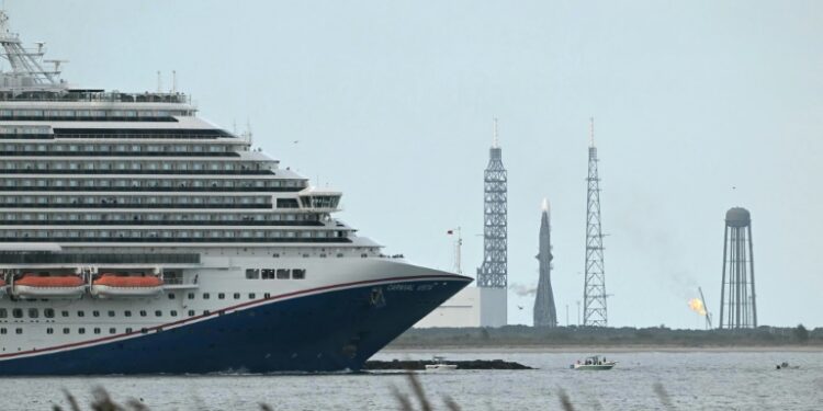 A cruise ship sails by Blue Origin's New Glenn rocket, which has scrubbed its launch for weather issues at the Space Force Station in Cape Canaveral, Florida. ©AFP