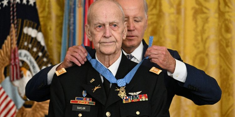 But after learning that a rescue chopper had been called off, Taylor, then a first lieutenant, defied a “direct order” to return to base, said Biden.”His response was just as direct — I’m getting my men out.”