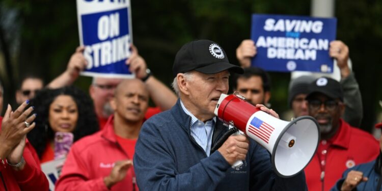 Joe Biden became the first sitting US president to stand on a picket line Tuesday, joining striking auto workers in Michigan in a bold pitch for blue collar votes against likely election rival Donald Trump.
