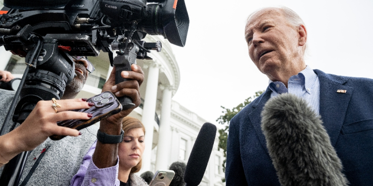 US President Joe Biden speaks to the media prior to departing on Marine One from the South Lawn of the White House in Washington, DC, on October 3, 2024, as he travels to Florida and Georgia to view damage from Hurricane Helene. / ©AFP