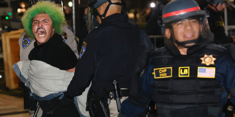 Earlier, UCLA students clad in white helmets linked arms and formed a line facing off against officers, who were detaining protesters and leading them away.