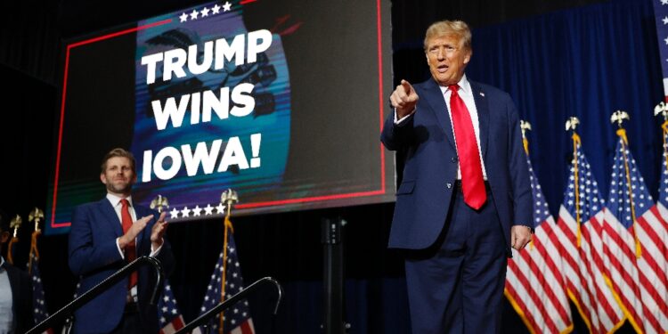 Donald Trump romped to a landslide victory Monday in Iowa’s caucuses — the first vote in the US presidential race — cementing his status as the presumptive Republican standard-bearer to challenge President Joe Biden in November’s election.The former president has led polling for more than a year, but the contest offered the clearest insight yet into his ability to convert that advantage into a stunning White House return.Major US networks took just half an hour to call the race, with Trump taking 51 percent of the vote and opening an unprecedented 30-point gap over Ron DeSantis — the biggest victory for an Iowa challenger in modern history.The Florida governor and Trump’s other main rival — former UN ambassador Nikki Haley — were locked at 21 and 19 percent respectively, with DeSantis projected to take the runner-up spot.”