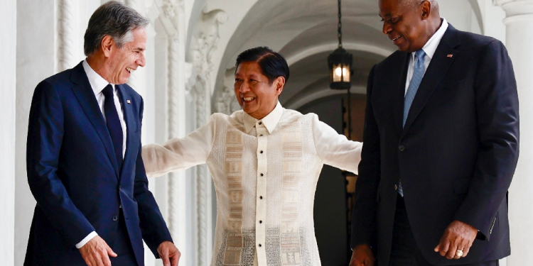 Philippine President Ferdinand Marcos (C) welcomes US Secretary of State Antony Blinken (L) and Defense Secretary Lloyd Austin / ©AFP