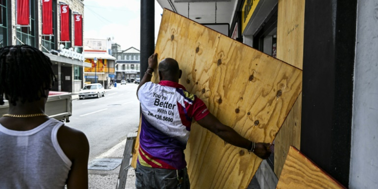 A man prepares to board up a shop window as people prepare for the arrival of Hurricane Beryl in Bridgetown, Barbados. ©AFP