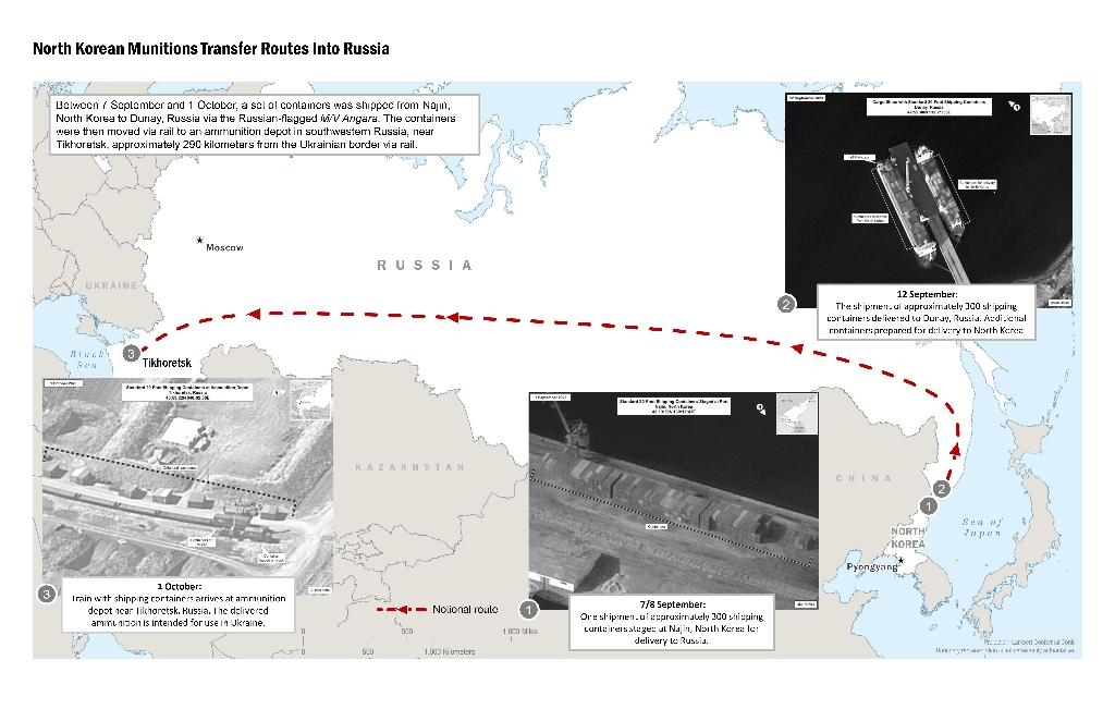 Read moreDetailsNorth Korea has delivered more than 1,000 containers of military equipment and munitions to Russia in recent weeks for use in Ukraine, the White House said Friday. The statement comes...