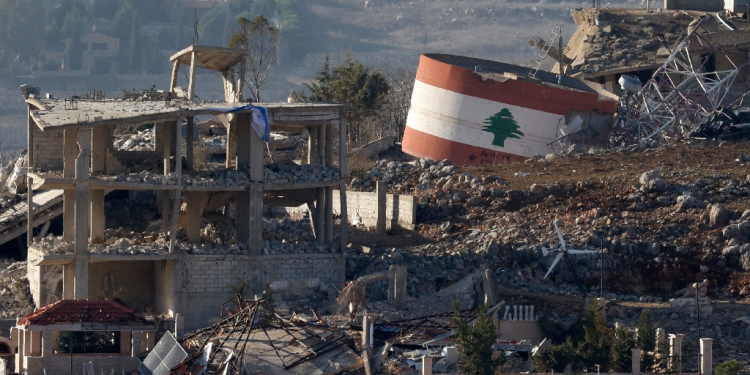 An Israeli flag hangs on a destroyed building while a Lebanese flag is painted on another in the southern Lebanese village of Meiss El-Jabal / ©AFP