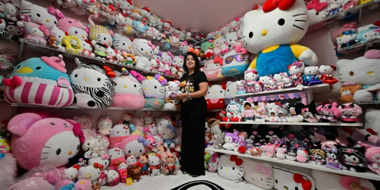 “People my age, you know, we are told many times, ‘Hello Kitty is for little kids,’ and I laugh at that,” said Helen from Riverside County, conceding she is “50-plus”. Helen, who drives a Hello Kitty-decorated SUV and runs the local fan club “Hello Kitty SoCal Babes,” has been “obsessed” with the character since its 1970s US debut. Her vast collection of Hello Kitty plushies “make me feel warm,” she said, describing spending hours among the soft toys, many of them rare, on a regular basis. “Something in my inner child gets healed,” she said.