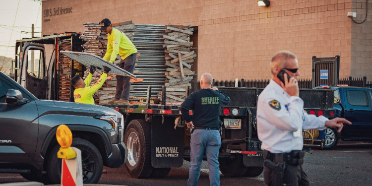 Workers unload fencing from a truck at the Maricopa County Election and Tabulation Center in Phoenix, Arizona, on November 4, 2024 / ©AFP