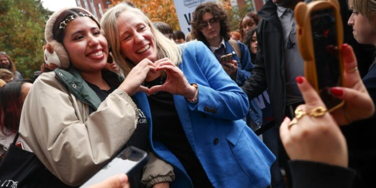 Victorious Virginia Democratic gubernatorial candidate Abigail Spanberger poses for a photograph with a supporter during a rally at Virginia Commonwealth University on November 3, 2025 in Richmond, Virginia. ©AFP