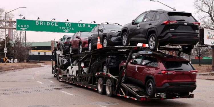 A car hauler carries Toyota RAV4 vehicles as it enters to cross the Ambassador Bridge in Windsor, Ontario to go to Detroit, Michigan on February 3, 2025 / ©AFP