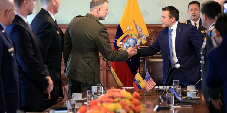 This handout picture released by the Ecuadoran Presidency shows President Daniel Noboa shaking hands with US Southern Command chief General Francis Donovan during a meeting in Quito / ©AFP