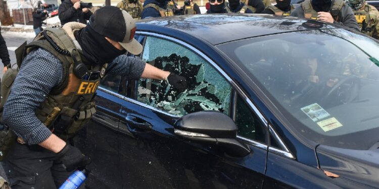A federal officer breaks a car window to begin the process of removing a woman from her vehicle near the area of an ICE operation in Minneapolis, Minnesota / ©AFP