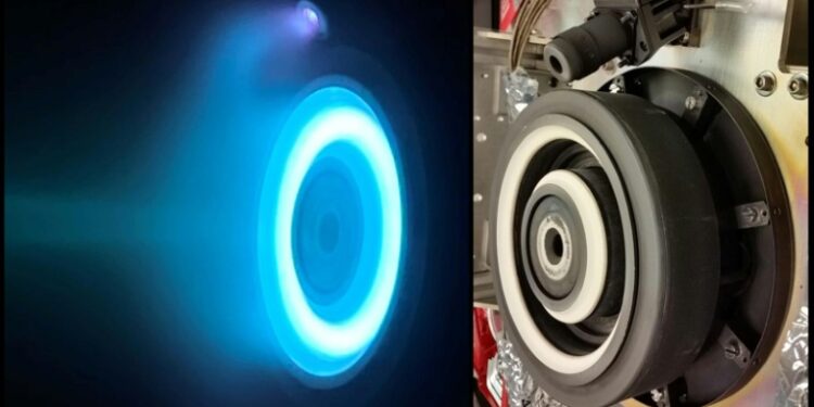 Psyche’s solar arrays convert light into electricity, providing the power for its four solar electric or “Hall-effect” thrusters.These use electromagnetic fields to accelerate and expel ions (charged atoms) of xenon, the same inert gas used in car headlights and plasma TVs.