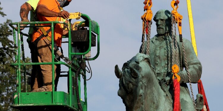 The towering bronze statue of General Robert E. Lee, who commanded the Army of Northern Virginia during the bloody 1861-65 conflict, was removed in July 2021 from a public park in Charlottesville, Virginia.
