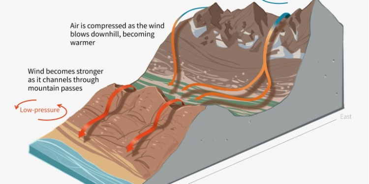 Los Angeles (United States) (AFP) – Helping drive the wildfires in the US city of Los Angeles are the so-called Santa Ana winds, a weather phenomenon known to dry out “the hills and the nerves to flash point.” The windstorms occur when cold air gathers in the neighboring states of Nevada and Utah. As it moves west and then rushes down California’s mountains, it heats up — and dries out.