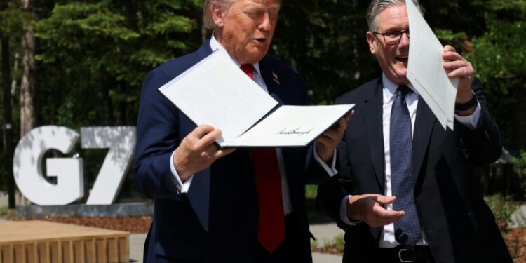 “I like them. That’s the ultimate protection,” Trump told reporters after a meeting with British Prime Minister Keir Starmer on the G7 sidelines. At a media conference marking the deal, Trump opened a folder to display the signed agreement, only for the paperwork to slide out and spread across the ground. “Oops, sorry about that,” he said as Starmer scrambled to gather up the loose sheets and stuff them back in the folder.