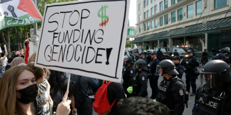 The crisis in Gaza was a dominant theme for the crowd of about 500 gathered in front of Calgary’s main municipal building — one of several areas in the city designated as protest zones. Police said no protesters were present at the other two local demonstration zones, including one near the Calgary airport where the leaders began arriving. “I’m here because I’m an Indigenous person,” said Emrys Peacock, who came by bus from British Columbia’s Okanagan region. “As an Indigenous person, I can’t ignore a fellow Indigenous nation being bombed, murdered and starved at the hands of an occupation, (something) my people have been through since colonization,” she added. Dozens of other protesters also railed against Israel’s war campaign in Gaza, which was triggered by the October 7, 2023 attack on Israel by Hamas.