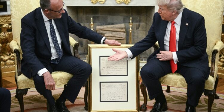 (AFP) – German Chancellor Friedrich Merz came through his Oval Office encounter with Donald Trump relatively unscathed Thursday — despite differences over Ukraine as the US president said it might be better to let Moscow and Kyiv fight it out like children. A month into his job, Merz unleashed a charm offensive on the 78-year-old Trump, presenting him with a framed copy of the birth certificate of his grandfather Frederick, who was born in Germany in 1869. Merz also hailed Trump as being the “key person in the world” when it came to ending the Ukraine war, saying the US leader could “really do that now by putting pressure on Russia.” It was a backhanded way of urging Trump to overcome his aversion to putting sanctions on Russia over its February 2022 invasion of Ukraine, as the more than three-year-old war grinds on.