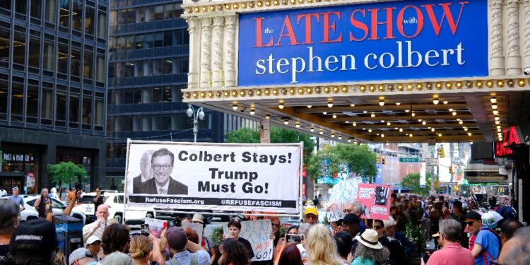Outside the taping at Midtown Manhattan’s Ed Sullivan theater, protesters held placards that said “Colbert Stays! Trump Must Go!” Audience member Elizabeth Kott, a 48-year-old high school teacher, called Colbert’s firing “terrible.” “It’s really awful that it’s come to that in this country, where companies feel the need to obey in advance. It’s really awful,” she told AFP.