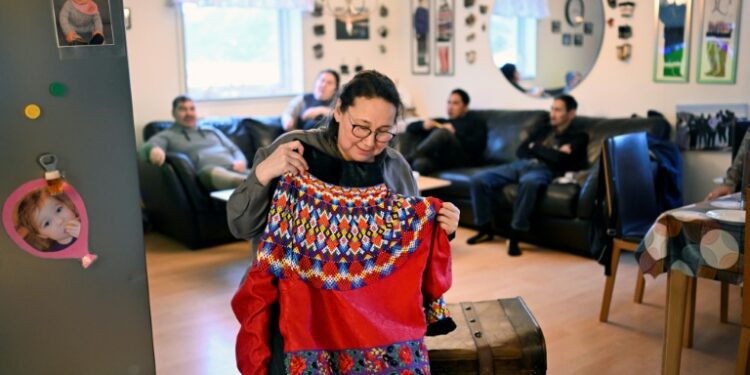 Dorthe Olsen holds up traditional clothing at her home in Sarfannguit. ©AFP