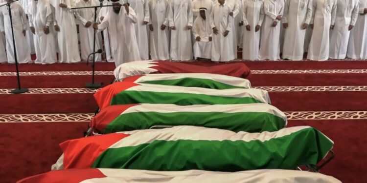 Facing the coffins, Qatar’s emir, Sheikh Tamim bin Hamad Al Thani, prayed alongside dozens of mourners, some wearing traditional white robes, others wearing military uniform. The dead were buried in the Mesaimeer Cemetery after the funeral at Sheikh Mohammed bin Abdul Wahhab Mosque. Authorities beefed up security, with checkpoints on access roads to the mosque.