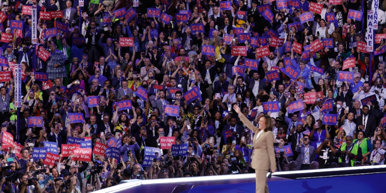 Delegates cheer as US Vice President and 2024 Democratic presidential candidate Kamala Harris makes a brief appearance at the start of the Democratic National Convention / ©AFP
