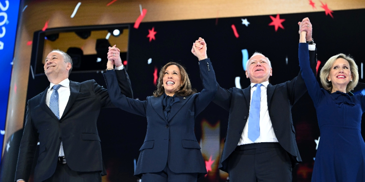 Kamala Harris, pictured here with running mate Tim Walz and their spouses at the Democratic National Convention, has been under pressure to do a media interview since launching her campaign last month / ©AFP