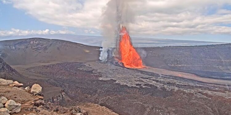 Los Angeles (United States) (AFP) – Hawaii’s Kilauea was spraying a spectacular fountain of lava on Monday, keeping up its reputation as one of the world’s most active volcanoes. For over a year now, Kilauea has been regularly throwing out thousands of tonnes of molten rock and gases since it burst to life in December 2024.