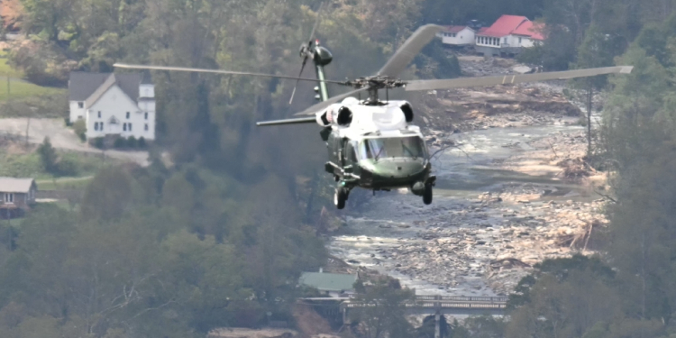 Marine One, carrying US President Joe Biden, flies above a storm impacted area near Asheville, North Carolina / ©AFP