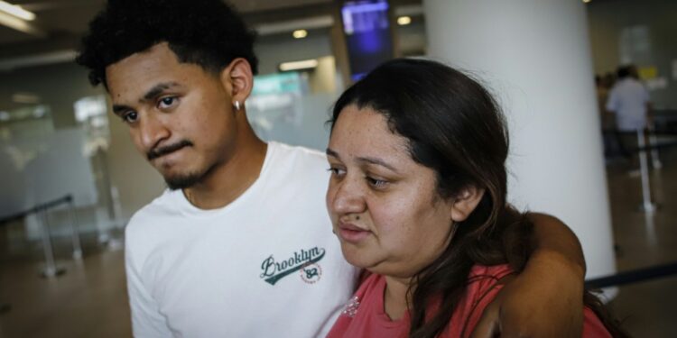 Emerson Colindres hugs his mother Ada Bell Baquedano after she returned to Honduras from the United States voluntarily following his own deportation. ©AFP