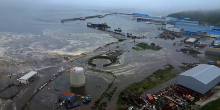 In Russia’s far east, a tsunami flooded the port town of Severo-Kurilsk, crashing through the port area and submerging the local fishing plant, officials said. Russian state television footage showed it sweep buildings and debris into the sea. Authorities said the population of around 2,000 people had been evacuated. The waves reached as far as the town’s World War II monument about 400 metres from the shoreline, said Mayor Alexander Ovsyannikov. Several people were injured in Russia by the quake, state media reported, but none seriously.