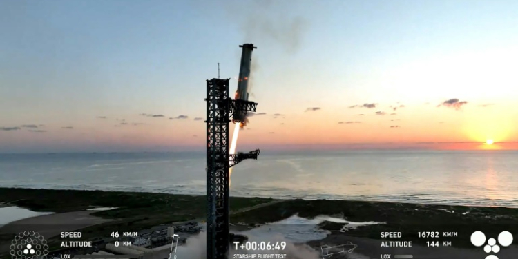Boca Chica (United States) (AFP) – SpaceX successfully “caught” the first-stage booster of its Starship megarocket Sunday as it returned to the launch pad after a test flight, a world first in the company’s quest for rapid reusability. The “super heavy booster” had blasted off attached to the Starship rocket minutes earlier, then made a picture-perfect controlled return to the same pad in Texas, where a pair of huge mechanical “chopsticks” reached out from the launch tower to bring the slowly descending booster to a halt, according to a livestream from Elon Musk’s SpaceX company.