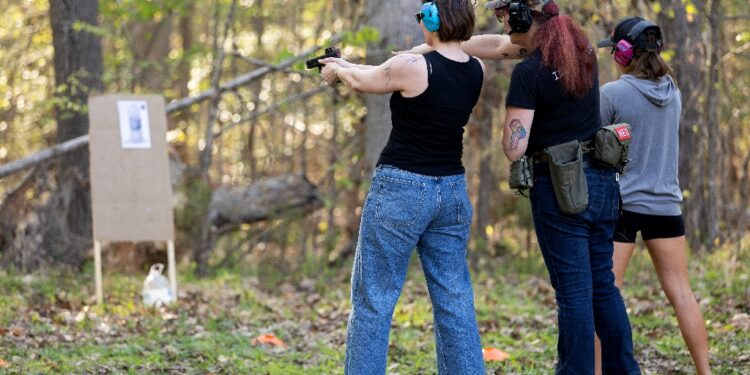 After buying a weapon, Collin and his wife Danni signed up for a class given by certified handgun instructor Clara Elliott, who says her business “doubled” after Trump was elected to serve a second term in the White House in November 2024. Since that time, her classes — which are tailored to women, minorities, and the LGBTQ community but open to everyone — have largely been sold out. “It’s been incredibly busy,” said Elliott, who sports a large tattoo on the inner side of her arm of Snow White carrying a sub-machine gun.