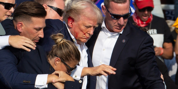 Secret Service agents shield former president Donald Trump as he is escorted off the stage following an attempted assassination / ©AFP