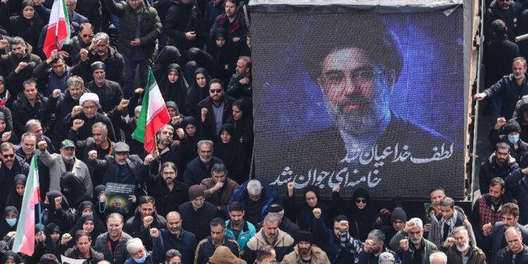 A screen displays a portrait of Iran's new supreme leader Mojtaba Khamenei during the funerals of Iran's Revolutionary Guards Corps (IRGC) commanders, army commanders and others killed in the early days of the United States and Israeli strikes on Iran, at Enghelab Square in Tehran on March 11, 2026 / ©AFP