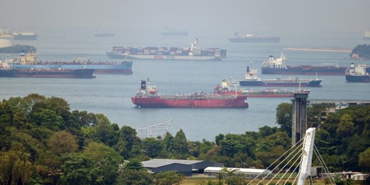 A container ship sails past oil tankers anchored in Singapore. ©AFP