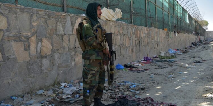 A Taliban fighter is pictured at the site of the Kabul airport bombing, which killed scores of people including 13 US troops. ©AFP