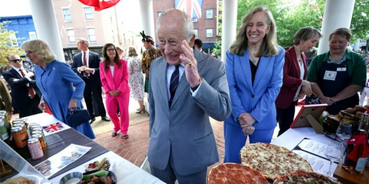 Britain's King Charles and Queen Camilla take in local food offerings at a block party in Front Royal, Virginia, as Governor Abigail Spanberger looks on . ©AFP