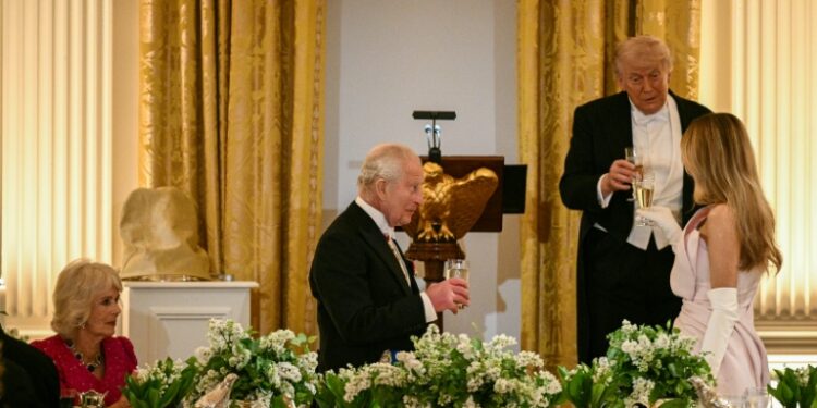 Washington (United States) (AFP) – Britain’s King Charles and Donald Trump hailed their countries’ longstanding ties at a White House state dinner Tuesday — despite the US president claiming the monarch agreed with him on Iran’s nuclear weapons.Over a lavish meal, Charles echoed the tone of his earlier speech to Congress in which he urged London and Washington to stick together, without directly mentioning the tensions over the US-Israeli war with Tehran.But in his toast to a gala dinner attended by tech titans and golfer Rory McIlroy, Trump made his first public comments on the sensitive topic during the four-day visit by the British royals.”We have militarily defeated that particular opponent,” Trump said at the White House dinner.”Charles agrees with me even more than I do — we’re never going to let that opponent have a nuclear weapon.”Trump has repeatedly lambasted British Prime Minister Keir Starmer over his opposition to the Iran war, and there is no indication that King Charles has shown support for the US leader’s stance.Nevertheless, both leaders strongly praised the “special relationship” between Britain and Washington, putting aside however briefly the transatlantic tensions.In his toast, Charles said he was “here to renew an indispensable alliance which has long been a cornerstone of prosperity and security.”Yet Charles pointedly mentioned the importance of international alliances like NATO that Trump has repeatedly disparaged — and called for continued support for Ukraine as it battles Russia’s invasion.”Together, we can meet the challenges of an increasingly complex and contested world,” he added.- Star guests -The menu for the lavish dinner included a garden vegetable veloute, spring herbed ravioli and Dover sole meuniere, followed by a White House honey and vanilla bean cremeux. Invited guests included Apple boss Tim Cook, Amazon’s Jeff Bezos, Nvidia’s Jensen Huang, and two-time Masters-winning golfer Rory McIlroy, who was born in Northern Ireland.The king and the president also struck a light-hearted tone, with Charles joking about Trump’s recent comments that allies would be speaking German if not for US support in World War II.”Dare I say that, if it wasn’t for us, you’d be speaking French,” Charles quipped, referring to the contest between the colonial powers of Britain and France before US independence 250 years ago.Trump meanwhile hailed Charles’s “fantastic” speech to Congress, adding: “He got the Democrats to stand — I’ve never been able to do that.”The king received a warm reception from lawmakers in Congress as he urged the United States on Tuesday to stand firm with its Western allies, and broached topics like the environment that Trump often scorns.Charles stressed that “unyielding resolve” was needed to secure a “just and lasting peace” in Ukraine, which has been fighting a full-scale invasion by Russia since 2022.- ‘No closer friends’ -In just the second speech to Congress by a British monarch following his mother Elizabeth II in 1991, Charles also pointed to shared democratic traditions that opponents have accused Trump of undermining.He noted that the British Magna Carta had been cited in more than 160 US Supreme Court cases, highlighting — to rapt applause from the opposition Democrats — the principle that executive power is subject to checks and balances.Trump earlier hailed Britain as America’s closest ally as he welcomed Charles and Queen Camilla to the White House with pomp, ceremony, a 21-gun salute and a flypast.”In the centuries since we won our independence, Americans have had no closer friends than the British,” Trump said.The visit comes at a delicate moment, with Trump criticizing Britain over its stance on Iran and other policies.Despite the tensions, the US president struck a jovial tone, joking about his Scottish-born mother having “a crush on Charles” and making a jibe about the British weather.Security has been tight during the visit following an alleged assassination attempt against Trump at a weekend Washington media gala.”Such acts of violence will never succeed,” Charles said.The royals will visit New York on Wednesday, touring the 9/11 memorial, before departing Thursday for Bermuda.