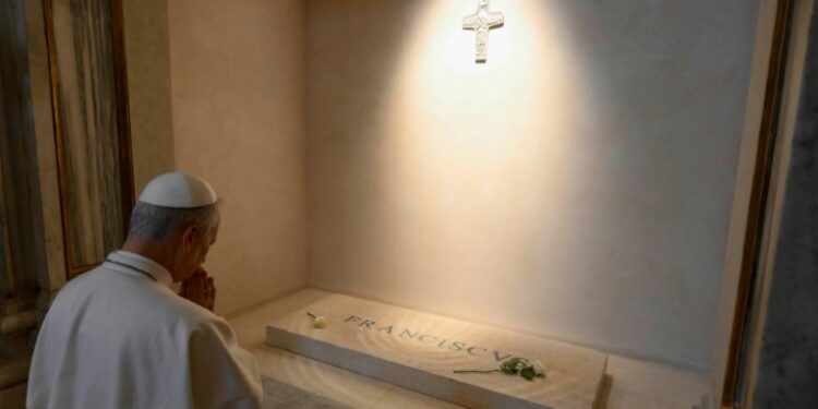 Vatican City (AFP) – Leo XIV prayed at the tomb of Pope Francis on Saturday, just two days after being elected new head of the Catholic Church and hours after vowing to humbly follow in his predecessor’s footsteps. Vatican News published a photo of the white-robed pope kneeling before Francis’s simple marble tomb at the basilica in central Rome, where the faithful are still queueing to pay their respects.