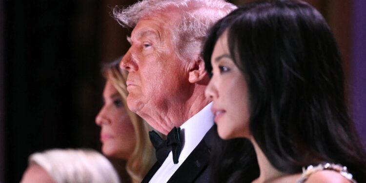 (L/R) White House Press Secretary Karoline Leavitt, US First Lady Melania Trump, US President Donald Trump and CBS News senior White House correspondent Weijia Jiang attend the White House Correspondents dinner at the Washington Hilton in Washington / ©AFP